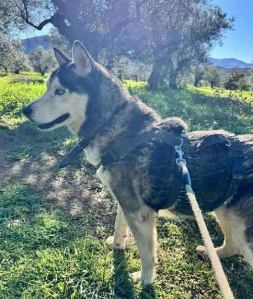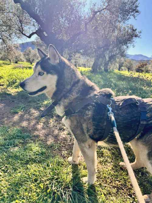 Onze Workawayer Jamie spotte een prachtige en gezond ogende Husky aan de ketting in een veld. Bij nadere inspectie bleek hij water en voer te hebben, er goed verzorgd uit te zien en ook nog eens super vriendelijk te zijn. Maar een hond aan de ketting in een veld is niet oké en bovendien strafbaar. Dus begon het onderzoek naar een baasje.